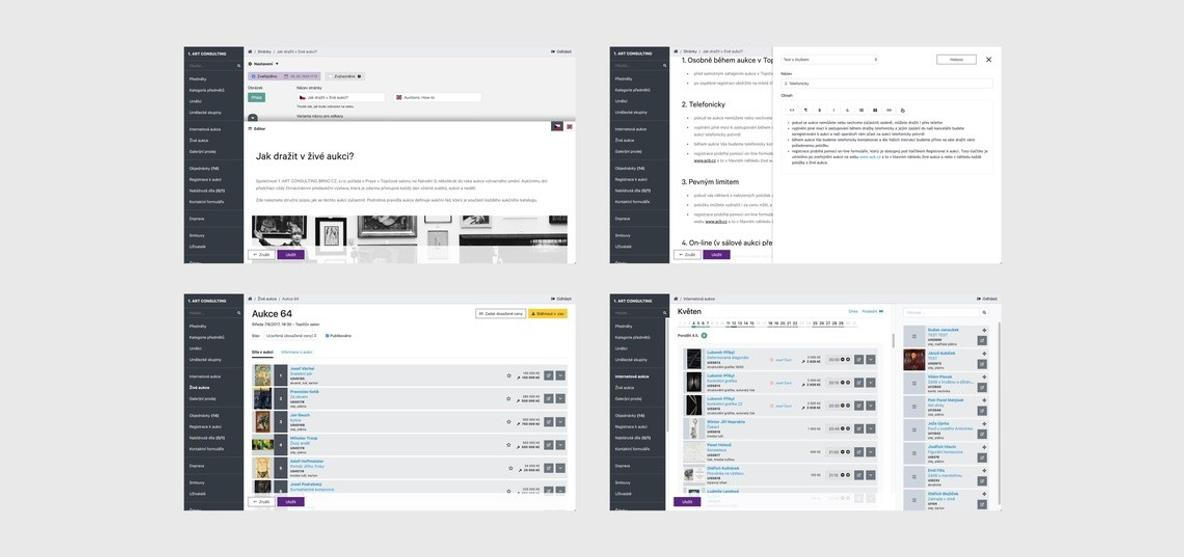 Pro 1. Art Consulting jsme implementovali kompletní řešení postavené na naší aukční platformě Auctea. Systém podporuje online aukce s WebSocket real-time přihazováním i sálové aukce s live streamem a synchronizací online a fyzických příhozů.